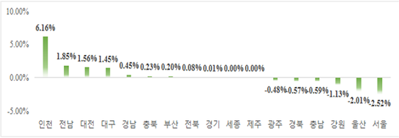 지난달 기준, 3.3m2당 민간아파트 평균 분양가격이 가장 많이 오른 지역은 인천(+6.16%)이었으며 전남(+1.85%)과 대전(+1.56%)이 각각 그 뒤를 이었다.