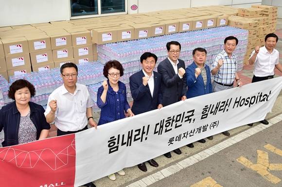 롯데물 수원점은 경기도의료원 수원병원, 아주대병원, 성빈센트병원, 동수원병원, 이춘택병원 등 5개 병원을 찾아가 메르스 확산 방지를 위해 힘쓰고 있는 의료진을 위한 생수, 커피, 휴지 등 생필품을 전달했다.