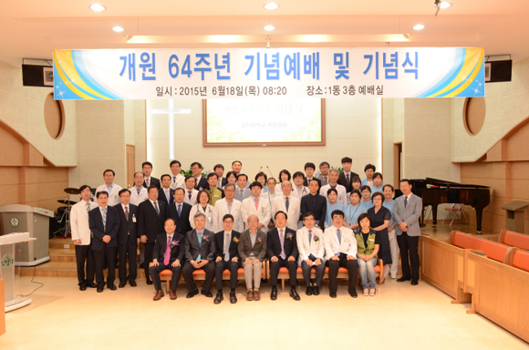 고신대학교복음병원(병원장 이상욱)이 재단 주요 인사들이 참석한 가운데 개원 64주년(개원기념일 1951.6.21.)을 맞아 18일 오전 병원 예배실에서 기념예배 및 기념식을 열었다.