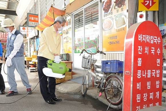 곽 시장은 소독기를 들고 시장 내부에 위치한 오색경로당과 시장 주변을 다니며 직접 방역을 실시했고 오산시보건소 방역소독원과 사회적기업인 씨에스코리아 직원도 함께 오색시장 전체에 방역을 실시했다.