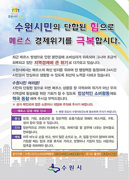 한편 수원시는 지역 경제 살리기의 대책방안으로 메르스 사태 조기수습, 소비 진작 분위기 조성, 소규모 행사를 중심으로 정상 개최 유도, 메르스 피해 중소기업과 소상공인 지원 대책 등을 추진하고 있다.