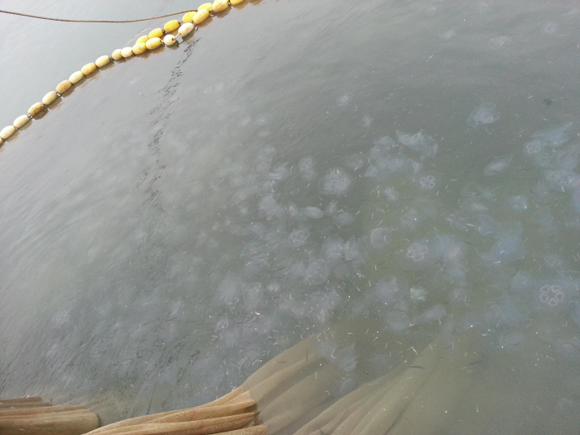 ▲경남 거제 학동 정치망에 유입된 보름달물해파리 모습. (사진제공=국립수과원)