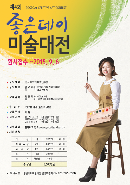 원서접수 마감은 9월 6일까지이며, 자세한 사항은 좋은데이 나눔재단 홈페이지(www.gooddayfd.or.kr)나 좋은데이 미술대전 운영위원회(Tel.070-7775-3574)로 문의하면 된다.