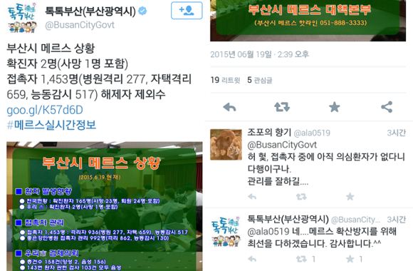 ▲실시간 메르스 정보 공개 중인 부산시 SNS에 달린 시민 답변글. (사진=부산시 트위터 캡처)