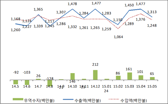 20일 부산세관이 발표한 ‘2015년 5월 부산지역 수출입 동향’에 따르면, 전년동월 대비 수출은 12.7% 증가한 13억1300만 달러, 수입은 1% 감소한 12억4800만 달러를 기록하며 무역수지 6500만 달러 흑자를 기록했다.
