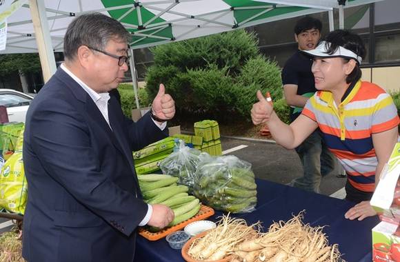 ▲농협중앙회 경기지역본부 오경석 본부장이 직거래장터에서 농업인과 대화를 나누고 있다.(사진=농협중앙회 경기지역본부)