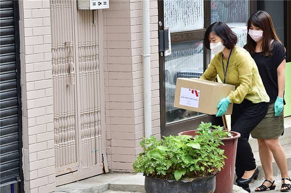 ▲수원시는 자가격리자의 생활불편을 해소하기 위해 공직자와 격리자간 1대1 맞춤형 지원시스템을 구축해 지원하고 있다. 시 공직자들이 자가격리자에게 지원 물품을 전달하는 모습(사진=수원시)