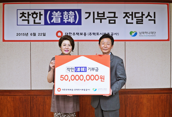 대한주택보증(사장 김선덕)은 22일 서울 여의도 사옥에서 '착한(着韓)기부금 전달식'을 갖고, 남북하나재단에 5천만원을 전달했다.