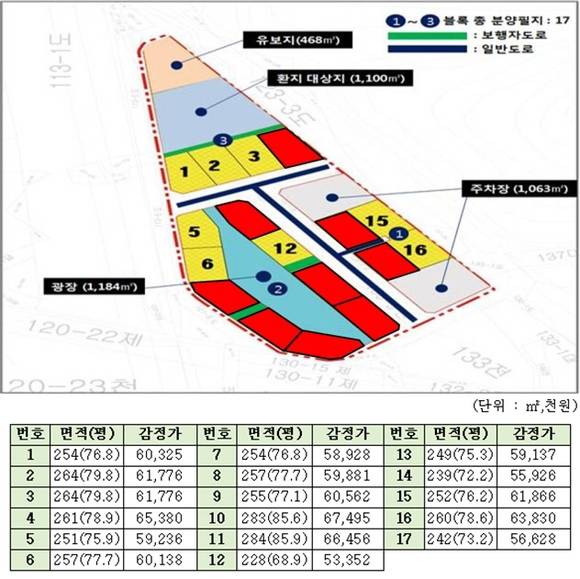 이에 1차 분양 결과 남아있는 필지는 8필지로 전체면적은 2,030㎡(228~264㎡)로 현재 남아있는 필지는 1~3번, 5~6번, 12번, 15~16번 필지로 분양금액은 5,335만2천~6,383만 원 등 분양 면적에 따라 다양하다.
