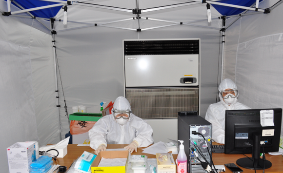 ▲메르스 선별진료소에서 불철주야 근무중인 동아대병원 의료진들. (사진제공=동아대병원)