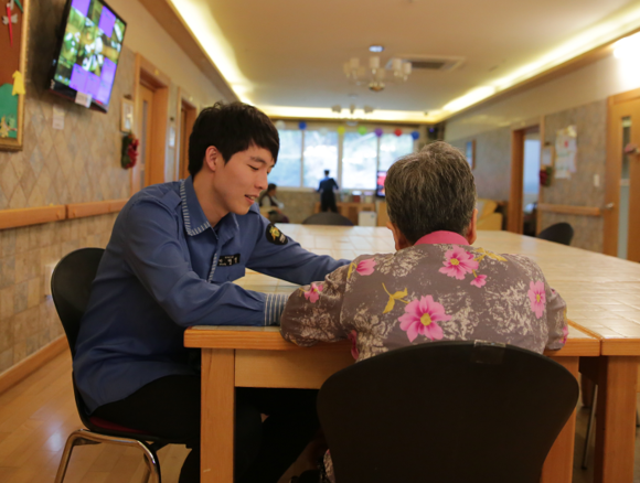 ▲사회복지 분야 사회복무요원이 치매할머니를 돌보고 있다. (사진제공=부산병무청)