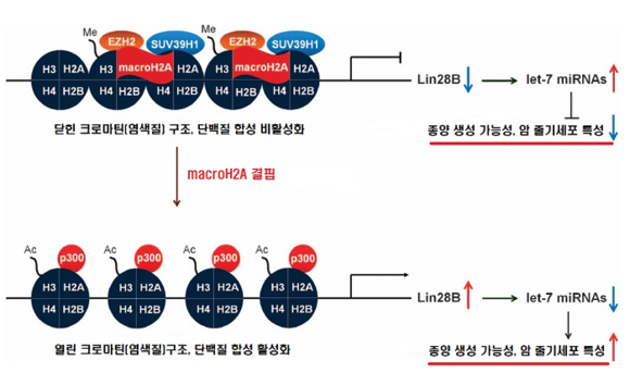 연구에 따르면, 방광암에서 MacroH2A1의 발현이 감소하자, 암을 유발하는 Lin28B의 발현이 촉진됐다. 이러한 Lin28B의 과발현은 암의 증식과 방사선 저항성과 같은 종양줄기세포에서 나타나는 특징을 강화한다는 것을 확인했다.