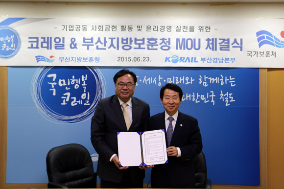 부산지방보훈청(청장 유주봉)과 코레일 부산경남본부(본부장 박철환)는 23일 KTX부산역 5층 영상회의실에서 호국보훈열차 관련 업무협약을 체결했다.