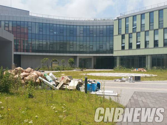▲건물 앞마당에 폐기물과 쓰레기가 쌓여가고 있다. 법원의 파산선고로 모뉴엘 직원들은 오래전 이 건물을 떠난 상태다. (제주=도기천 기자)