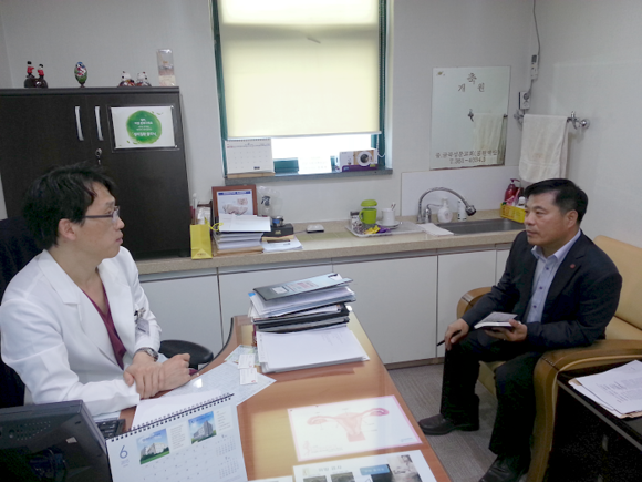 ▲건보공단 부산북부지사 김선진 보험급여부장(오른쪽)이 화명일신기독병원 정재혁 원장과 포괄간호서비스 시범사업 참여와 관련해 면담을 갖고 있다. (사진제공=건보공단 부산북부지사)