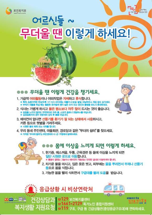 김영주 교육복지과장은 “폭염특보 발령시 65세 이상 노인과 학생, 농어민 등을 대상으로 가장 무더운 오후 2시부터 5시까지 휴식을 유도하는 무더위 휴식 시간제도 운영 등을 통해 폭염피해가 발생하지 않도록 살갑게 보살피는 시원한 복지대책에 만전을 기한다”고 밝혔다.