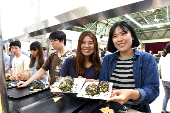 6.25전쟁 65주년을 맞은 25일, 부경대학교 워커하우스식당에서 '6.25전쟁음식 반값데이' 행사가 열려 학생들이 주먹밥과 양푼이부대찌개를 사먹고 있다. 이날 행사는 6.25전쟁에 대한 인식을 제고하고, 전쟁 당시 미8군 사령부의 임시지휘본부 역할을 했던 워커하우스식당의 역사적 의미를 알리기 위해 한시적으로 열렸으며, 오후 4시까지 진행된다. (사진제공=부경대)