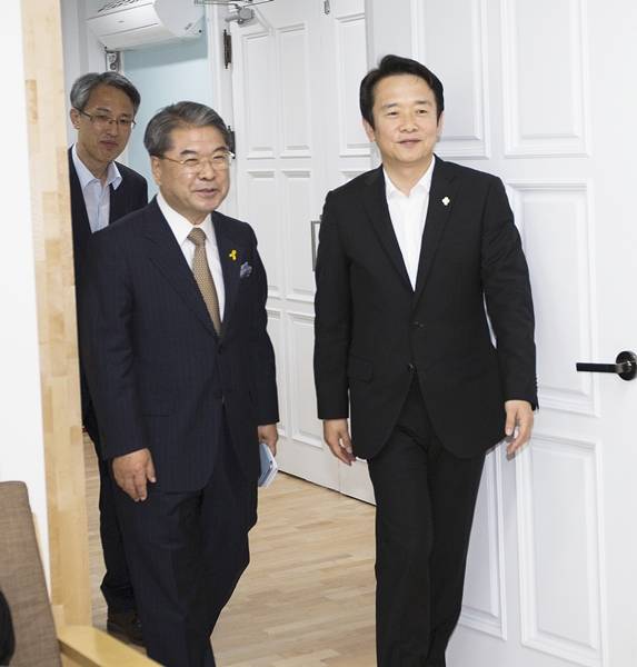 ▲25일 오전 경기도청 도지사 집무실에서 열린 "도-교육청 '2+2' 교육정책협의회"에서 남경필 경기도지사와 이재정 경기도 교육감이 집무실로 입장하고 있다.(사진=경기도)