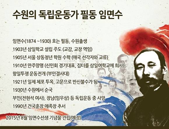 한편 독립운동가 필동 임면수 선생 기념사업추진위원회는 지난 2월 26일 발족식을 갖고 수원의 독립운동가 임면수 선생의 업적을 재조명해 그 정신을 기리고자 활동을 이어왔다.