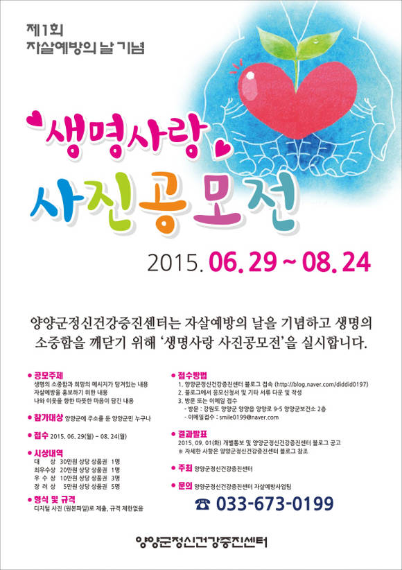 수상작은 오는 9월 1일 발표하고 수상된 작품은 자살예방의 날 주간인 9월 7일부터 11일까지 양양전통시장, 양양군보건소 등에 전시할 예정이다.