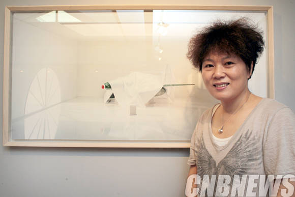 ▲25일 통의동 진화랑에서 전시 중인 '차가운 영웅들' 작품과 함께한 임안나 작가.(사진=왕진오 기자)