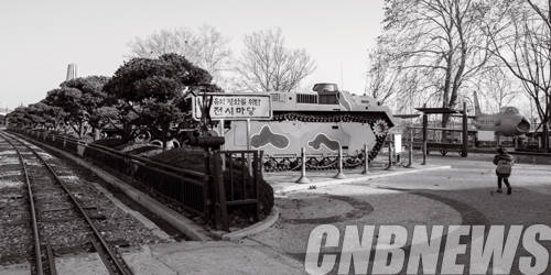 흑백으로 기록한 풍경 사진들은 우리가 무심코 지나치는 상황을 일깨우기 위한 작가의 의도가 역력하다. 살상무기로 전쟁의 최전방에 나섰던 무기들 앞에 포토존 명판이 붙어있고, 유치원생들이 아무것도 모른 채 기념사진을 찍기에 바쁜 모습을 담았다.