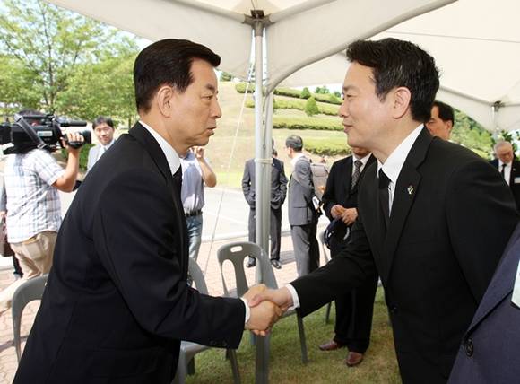 ▲29일 오전 해군2함대사령부에서 열린 제2연평해전 13주년 기념식에 참석한 남경필 경기도지사가 한민구 국방부장관과 인사를 나누고 있다.(사진=경기도)