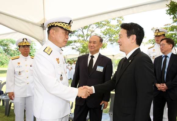 ▲해군2함대사령부에서 열린 제2연평해전 13주년 기념식에 참석한 남경필 경기도지사가 정호섭 해군참모총장과 인사를 나누고 있다.(사진=경기도)
