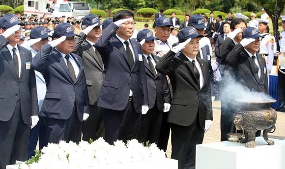 ▲29일 오전 해군2함대사령부에서 열린 "제2연평해전 13주년 기념식"에 참석한 남경필 경기도지사가 추모식에 예를 갖추고 있다.