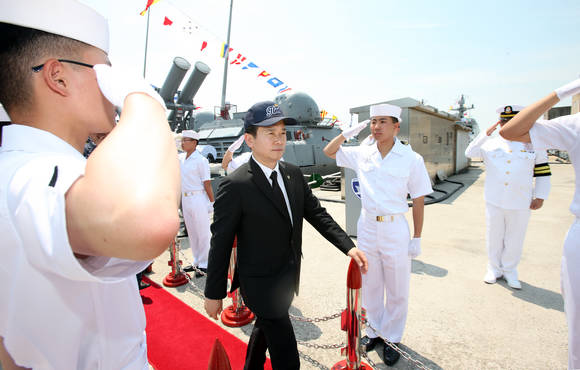 ▲29일 오전 해군2함대사령부에서 열린 제2연평해전 13주년 기념식에 참석한 남경필 경기도지사가 군함에 하선하고 있다.