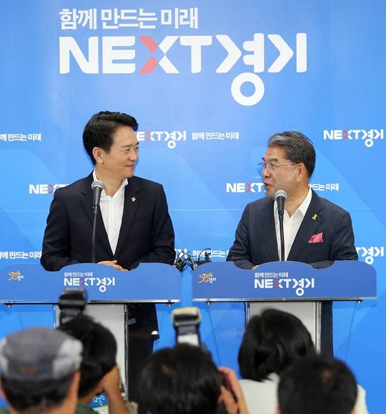 30일 오전 경기도청 브리핑룸에서 취임 1주년을 맞이한 남경필 경기도지사와 이재정 경기도교육감이 공동 기자회견을 열고 "도민을 위한 상생과 화합의 도정운영, 학생과 학부모들을 위한 꿈과 희망의 경기교육을 목표로 쉼없이 달려가겠다"고 밝혔다.