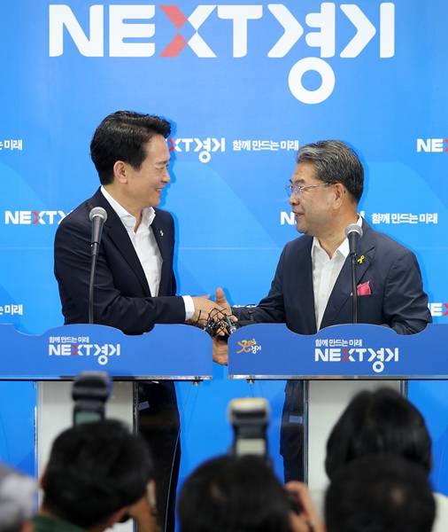 ▲남경필 경기도지사와 이재정 경기도 교육감이 취임 1주년 공동 기자회견을 마치고 악수를 하며 화합을 다짐하고 있다.