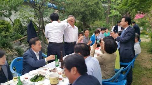 이날 두 사람의 ‘러브샷 화해’는 경기도 부천에 있는 원혜영 의원 자택에서 열린 70여명이 모인 대규모 의원단 회합에서 이뤄졌다. 이날 오전 여의도 한 호텔에서 비노 중진 의원들과 당무복귀 여부를 논의한 바 있는 이 원내대표가 먼저 오후 5시 20분께 모습을 드러냈고 곧이어 국회에서 고위전략회의를 마친 문 대표가 장소에 들어왔다.