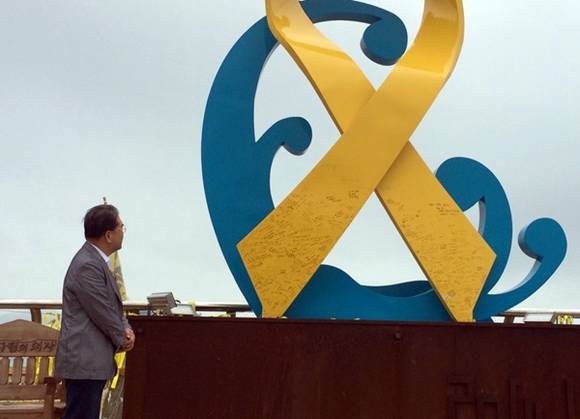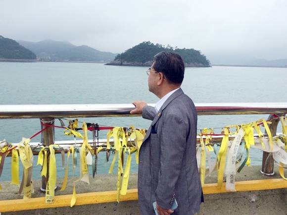▲팽목항을 찿은 이재정 경기도교육감이 먼 바다를 바라보며 세월호 희생자들의 넋을 기리고 있다.(사진=경기도교육청)