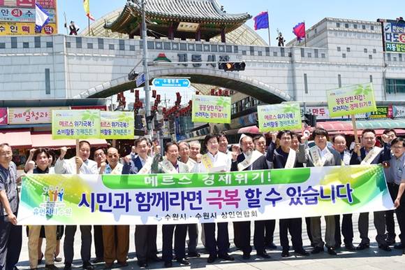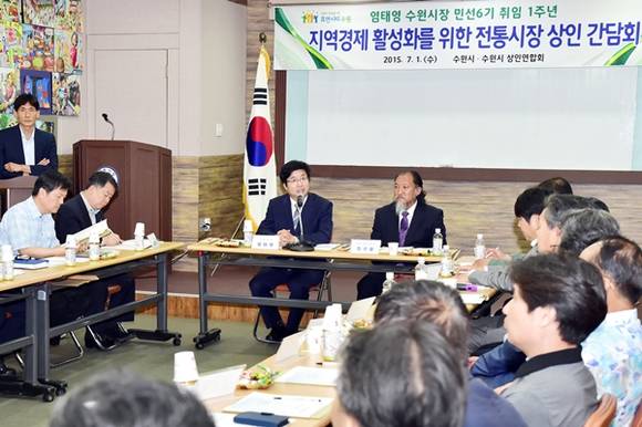 염태영 수원시장은 1일 전통시장 회장단과 경제 활성화 방안 간담회를 여는 등 메르스 경기침체 극복을 위한 현장대화로 민선6기 2년차 첫날 행보를 시작했다. 이날 지동시장 상인회 사무실에서 22개 전통시장 회장들과 만난 자리에서 방역 시스템 구축과 경제 활성화를 위해 730억원의 추가경정예산을 투입, 경제회복을 체감할 수 있게 하겠다고 밝혔다.