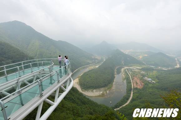 한국의 그랜드 캐니언 스카이워크로 알려진 정선 스카이워크에서 동강 비경의 하나인 한반도 지형이 아름답게 내려다 보인다.