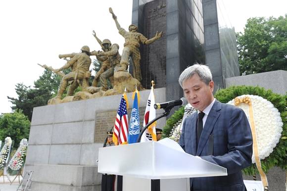 ▲곽상욱 오산시장은 추도사를 통해 “우리 조국을 구하는데 크나큰 역할을 하셨고 이 땅에 자유와 평화를 주신 참전용사들의 희생 정신을 결코 잊지 않을 것”이라고 말했다.(사진=오산시)