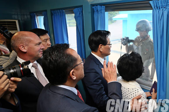 7월 3일 오전 믹타 국회의장단 내외 및 대표단이 판문점을 방문했다. 이날 함께한 정의화 의장과 대표단이 현장을 살펴보고 있다.