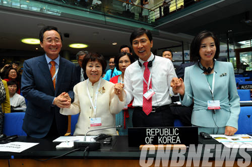 ▲‘백제역사유적지구’가 7월 4일(현지시각) 독일 본 월드컨퍼런에서 진행된 제39차 세계유산위원회에 회의에서 등재가 결정됐다.백제역사유적지구 등재 감사 인사하는 좌측부터 송하진 전북지사, 나선화 문화재청장, 안희정 충남지사,나경원 외교통일위원회 위원장.(사진=문화재청)