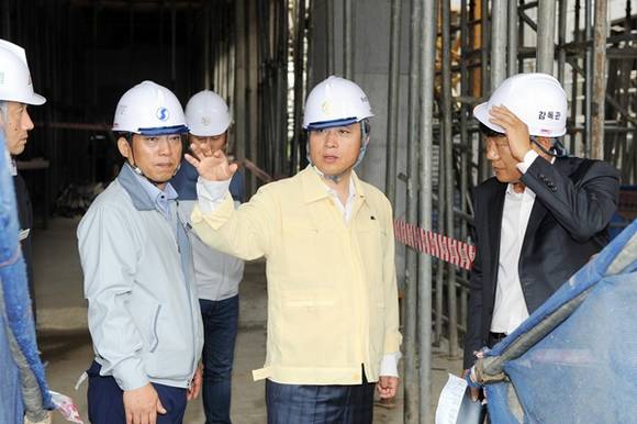 ▲세교종합사회복지관 건설 현장을 찿아 안전 상태를 점검하고 있는 곽상욱 오산시장 (사진=오산시)