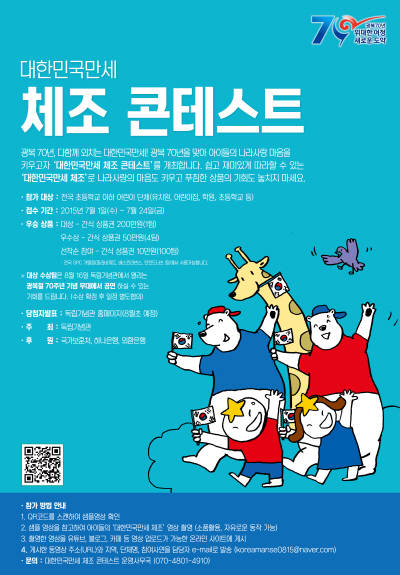 생활속에서 나라사랑하는 마음을 실천하기 위해 최근 개발된 ‘대한민국만세 체조’의 샘플 영상을 국가보훈처·독립기념관·하나은행·외환은행의 홈페이지에서 참고해 어린이들이 참여하는 영상을 유튜브·블로그·카페 등에 업로드한 후 게시한 동영상 주소(URL)를 사연과 함께 담당자 이메일(koreamanse0815@naver.com)로 발송하면 된다.