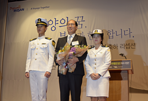 7일 오후 12시 롯데호텔부산 3층 크리스탈볼룸에서 부산시 주최로 열린 '임기택 국제해사기구(IMO) 사무총장 당선 축하 리셉션'에서 한국해양대학교 후배 재학생들이 임 당선인에게 꽃다발 증정 후 함께 기념촬영을 하고 있다.