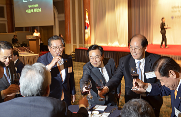 7일 오후 12시 롯데호텔부산 3층 크리스탈볼룸에서 열린 임기택 국제해사기구(IMO) 사무총장 당선 축하 리셉션에서 서병수 부산시장을 비롯한 이해동 부산시의회 의장, 서용교, 배덕광 국회의원 등 참석자들이 임 당선인의 축하를 위한 건배를 하고 있다.