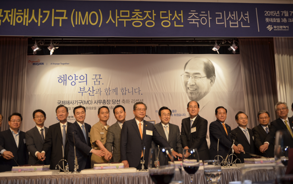 7일 오후 12시 롯데호텔부산 3층 크리스탈볼룸에서 부산시 주최로 열린 '임기택 국제해사기구(IMO) 사무총장 당선 축하 리셉션'에서 임 당선인을 비롯한 서병수 부산시장, 이해동 부산시의회 의장, 서용교, 배덕광 국회의원, 엄현성 해작사 사령관, 권기선 부산경찰청장, 신정택 세운철강 회장, 오거돈 전 해수부장관, 강병중 넥센타이어 회장 등 참석자들이 기념떡 커팅을 하고 있다.