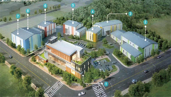 ▲성능고도화 시험연구센터 시설 조감도(①시험지원동 ②환경시험동 ③진동시험동 ④충격시험동 ⑤방화시험동 ⑥태양광투파/단열시험동 ⑦수중시험동 ⑧방폭시험동). (사진제공=부산시)