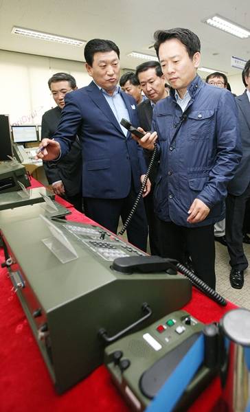 ▲남경필 도지사가 직원에게 제품 작동방법을 청취하며 제품을 자세히 살펴보고 있다.