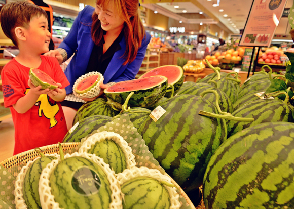 오는 13일 초복을 앞두고 롯데백화점 부산본점 지하 1층 청과코너에서는 미니수박인 복수박을 비롯, 싱싱하고 탐스러운 수박들을 선보여 한 여성고객이 아이와 함께 살펴보고 있다. (사진제공=롯데백화점 부산본점)