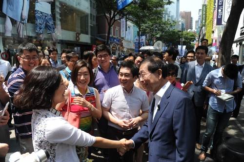 ▲박원순 서울시장이 지난 6일 중동호흡기증후군(메르스) 여파로 어려움을 겪고 있는 상인들을 격려하기 위해 방문한 서울 중구 명동에서 중국인 관광객을 만나 악수하고 있다.(사진=연합뉴스)