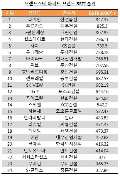 ▲브랜드스탁 BSTI 아파트 브랜드 평가 순위(출처: 브랜드스탁)