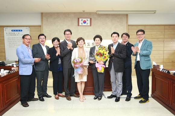 ▲왼쪽 5번째부터 안혜영(새정치민주연합)과 남경순(새누리당)의원.(사진=경기도의회)